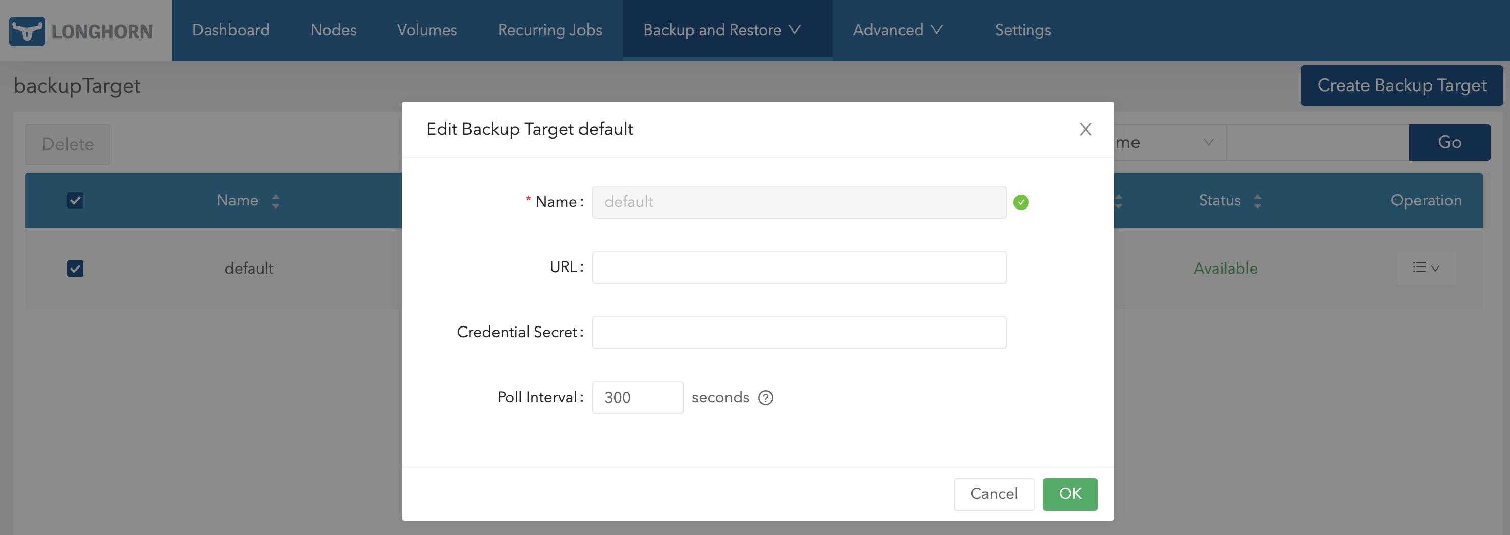 Go to the Longhorn UI. click Backup and Restore/Backup Targets, and create or edit a backup target.