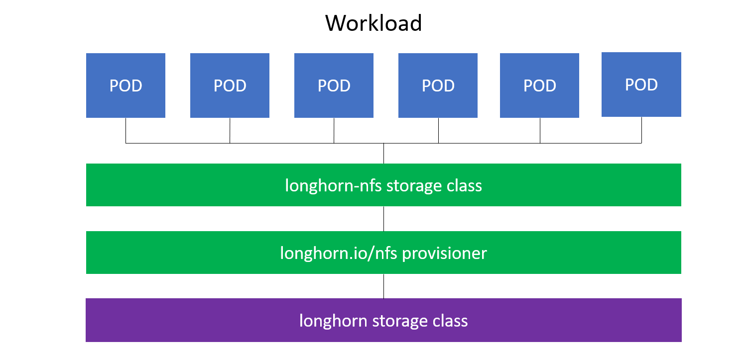 Longhorn supports RWX workloads via the nfs.longhorn.io provisioner.