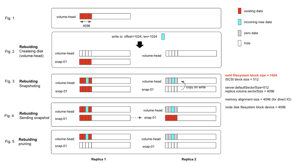 Let’s say that the volume has 1 replica initially and have 4k data in the volume head at the first 4k block. Also, assume that volume has number of desired replica count is 2.